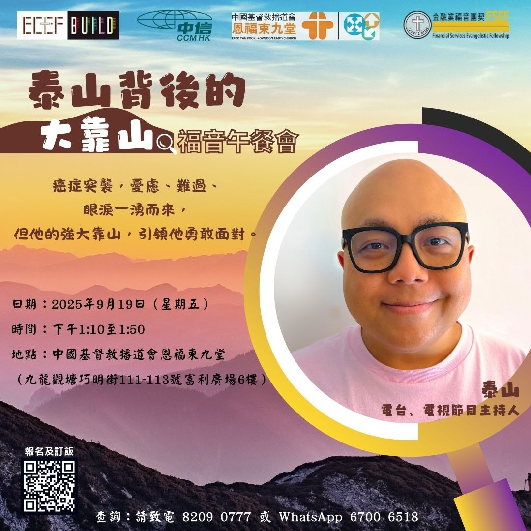 今次我們很榮幸邀請了泰山(電台、電視節目主持)來分享。歡迎弟兄姊妹邀請朋友參加,詳情如下: